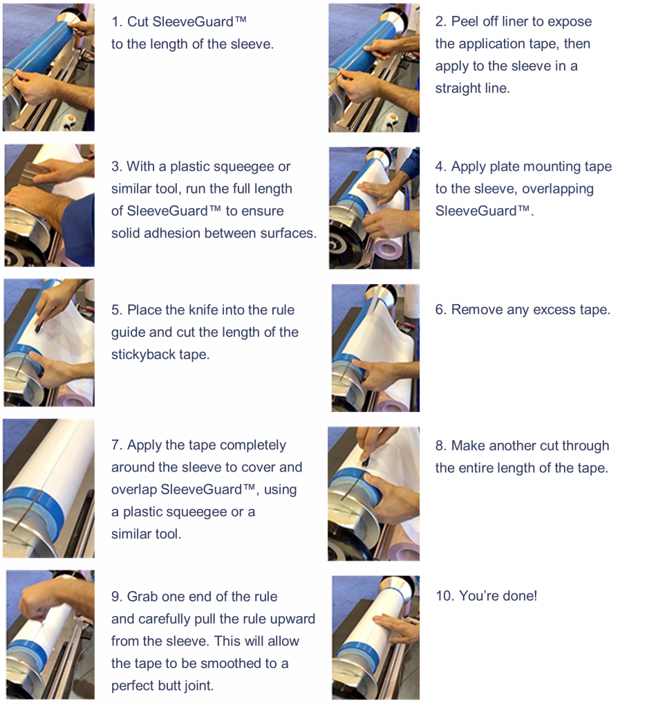 SleeveGuard™ is a heat-treated protective rule with integrated blade guide that prevents sleeve damage when applying stickyback plate-mounting tape to a printing sleeve.
